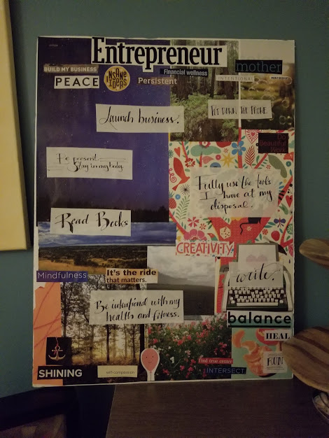 Our New Year’s day included going through stacks of magazines to find the right images and words to glue to poster board. Trying not to feel like a serial killer, we cut out words like “balance” and “peace” and placed them artfully on a picture of the redwoods.